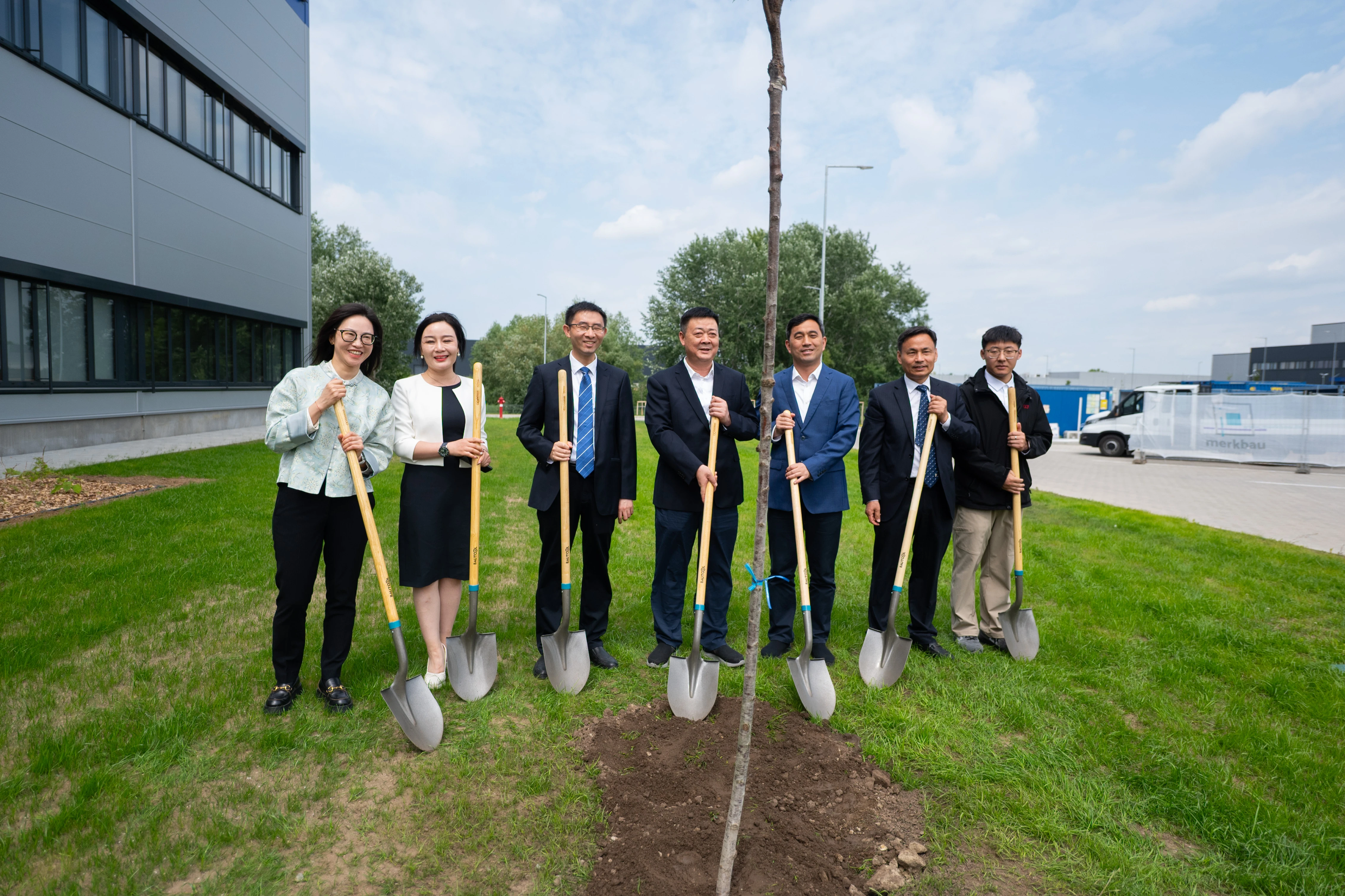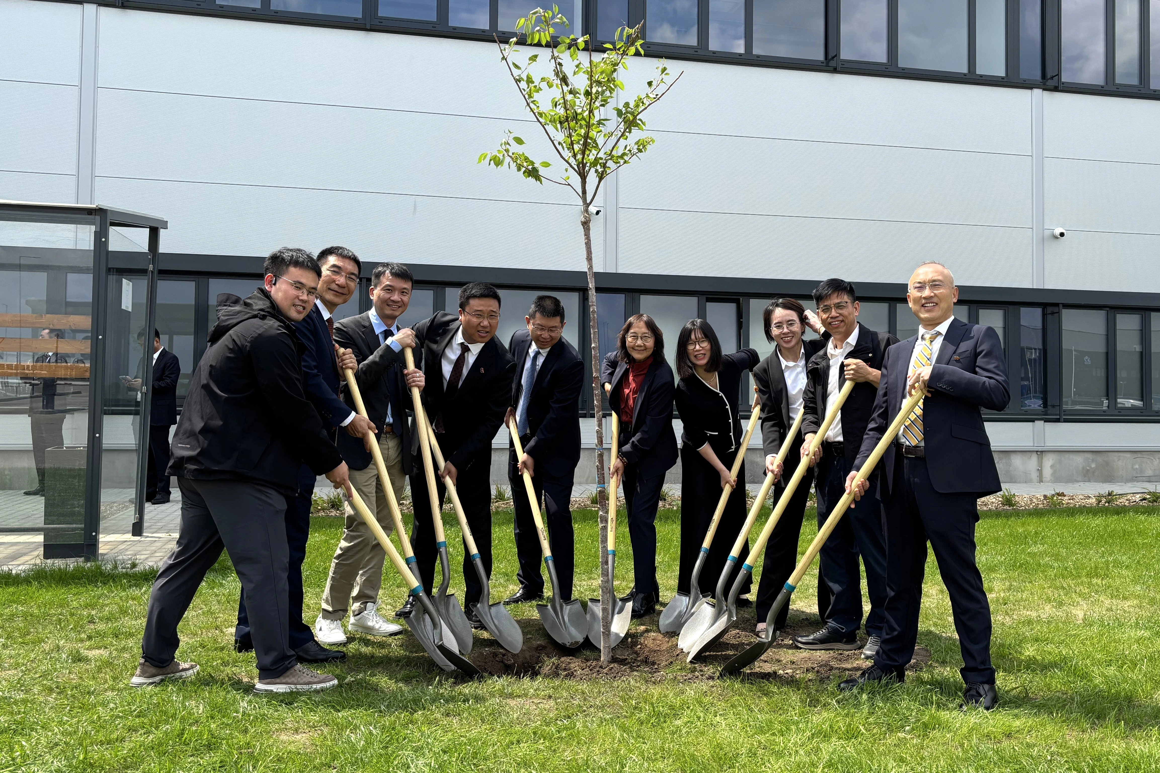 交接仪式结束后,与会领导、嘉宾共同参观了新厂房,包括办公区域、生产线规划区等,详细了解了工厂设计理念与功能布局,对EVORING的现代化、国际化建设成果给予高度评价。参观环节结束后,本次活动特别设置 “植树仪式” 作为象征性纪念环节,与会领导与嘉宾现场共同栽种三棵纪念树,以 “根植本地、共同成长” 的美好寓意,为活动留下富有生命力的印记。